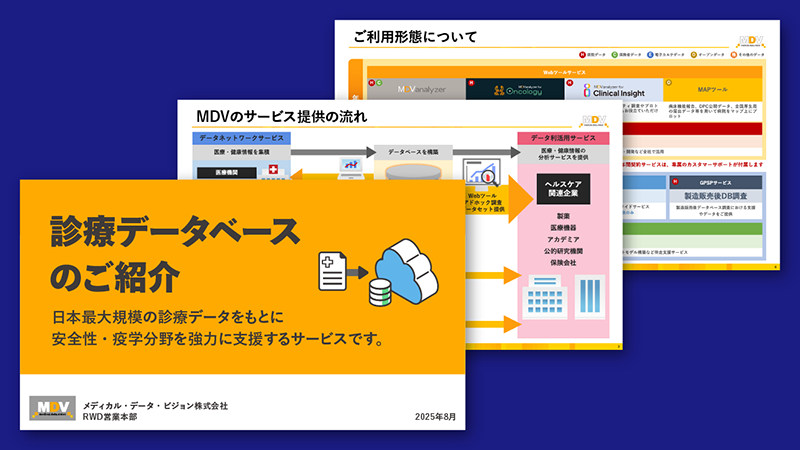 製薬企業・医療機器メーカー・医療機関・研究機関の皆さまへ医療ビッグデータの利活用に役立つ各種資料を、会員限定で無料ダウンロードいただけます。まずはお気軽にご覧ください!