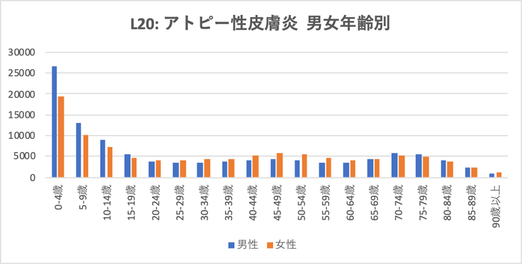 0~4歳が最も多く、特に男性で顕著に多いことがわかった。5~9歳、10~14歳と年齢が上がるにつれて患者数は急激に減少し、15歳以降は大きく減少する。成人以降は男女差が小さくなり、ほぼ同程度の患者数で推移している。また、60代以降の高齢層でも一定数の患者が存在しており、アトピー性皮膚炎は全年齢層でみられる疾患であることがグラフから読み取れた。