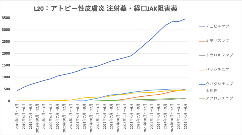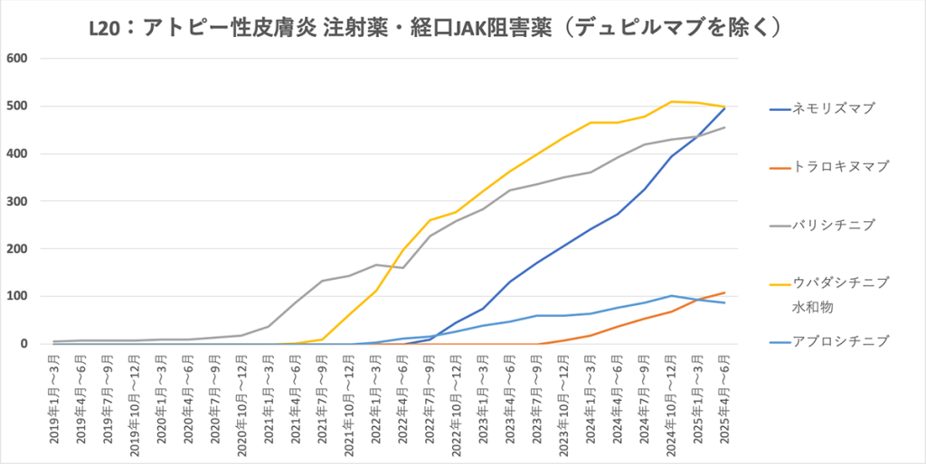 最後に、アトピー性皮膚炎治療で使われる主な注射薬、経口JAK阻害薬の処方患者数の推移を調査した。