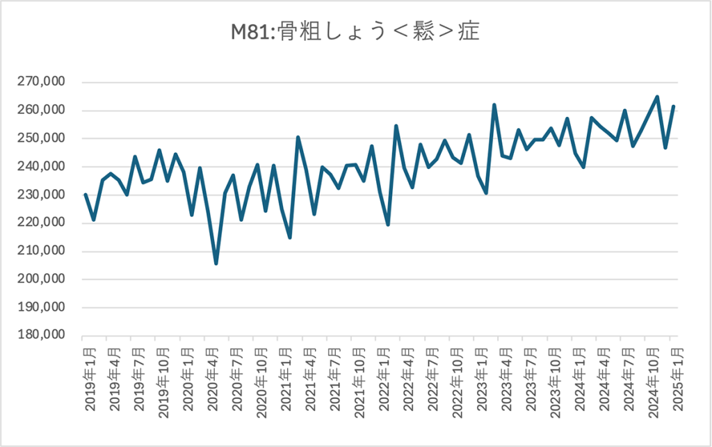 そこで、MDVデータを用いて、骨粗鬆症(M81)の患者動態および治療薬(ATCコード3群、一般名別)の使用実態を分析した。