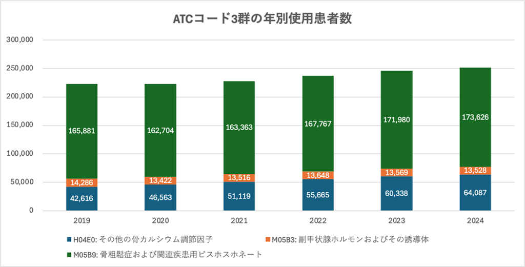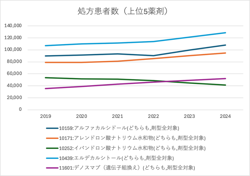 「その他の骨カルシウム調節因子」(同青)は、2019年の約4.2万人から2024年の約6.4万人へと、患者数が顕著に増加している。また、処方患者数の増加は、主に「その他の骨カルシウム調節因子」が牽引している。これは、高活性なデノスマブやロモソズマブといった薬剤が、新規患者や既存治療からの切り替え患者に使用されつつあることが読み取れた。