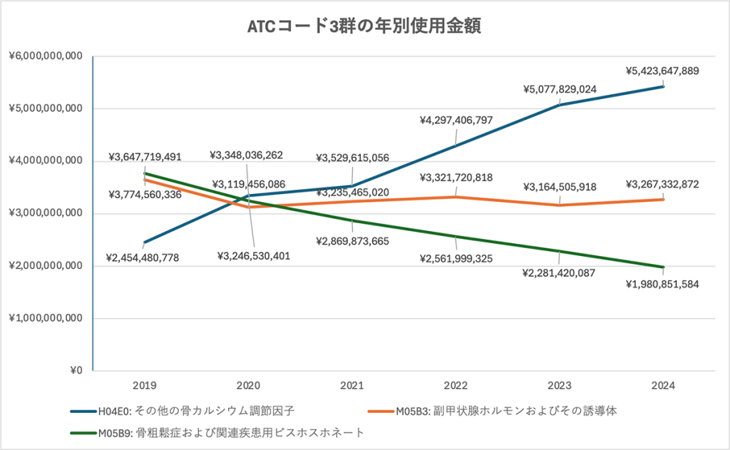 「その他の骨カルシウム調節因子」(折れ線グラフの青)は、2019年の約24.5億円から2024年の約54.2億円へと2倍以上に急増し、2021年以降は最も高い金額を占めている。