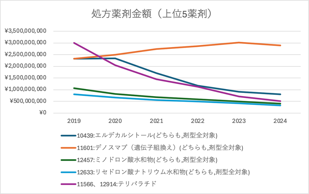 デノスマブの金額トップは、高単価と患者数増加の相乗効果を示している。一方で、テリパラチドの急激な金額減少は、バイオシミラーや後発品の影響、または他の骨形成促進薬への切り替えが進んでいることが読み取れた。