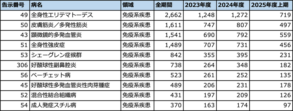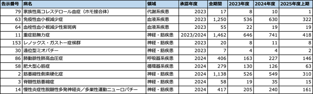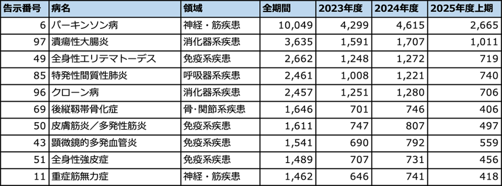 神経・筋疾患領域の年度別の推移に着目すると、慢性炎症性脱髄性多発神経炎/多巣性運動ニューロパチーが約17%増(205人→240人)、大脳皮質基底核変性症が約18%増(136人→161人)と大幅な伸びとなった。2025年度上期も前年度の半数を超えて推移しており、DPC病院への患者流入、あるいは診断精度の向上による疾患の顕在化が継続していると考えられる。また、ALSや脊髄小脳変性症といった1,000人規模の疾患がある一方、超希少疾患での増加率が高い点は、専門医への集約化が進んでいることを示唆している。
