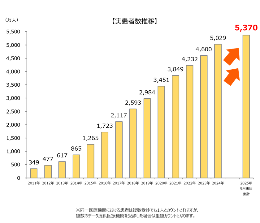 医療情報のネットワーク化を推進するメディカル・データ・ビジョン株式会社(本社:東京都千代田区 代表取締役社長:岩崎 博之)は、当社が保有する大規模診療データベースについて、2025年9月末集計で5,370万人となりましたことをお知らせいたします。
