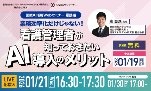 メディカル・データ・ビジョン株式会社(東京都千代田区、代表取締役社長:岩崎博之)は株式会社ALY(同中央区:代表取締役 中澤公貴)と共同で、医療AI活用Webセミナー・看護編「業務効率化だけじゃない!看護管理者が知っておきたいAI導入のメリット」を、2026年1月21日(水)16:30~17:30に開催します。セミナーの視聴を希望する方は、以下の登録URLからお申込みください。申込期限は2026年1月19日(月)正午までです。